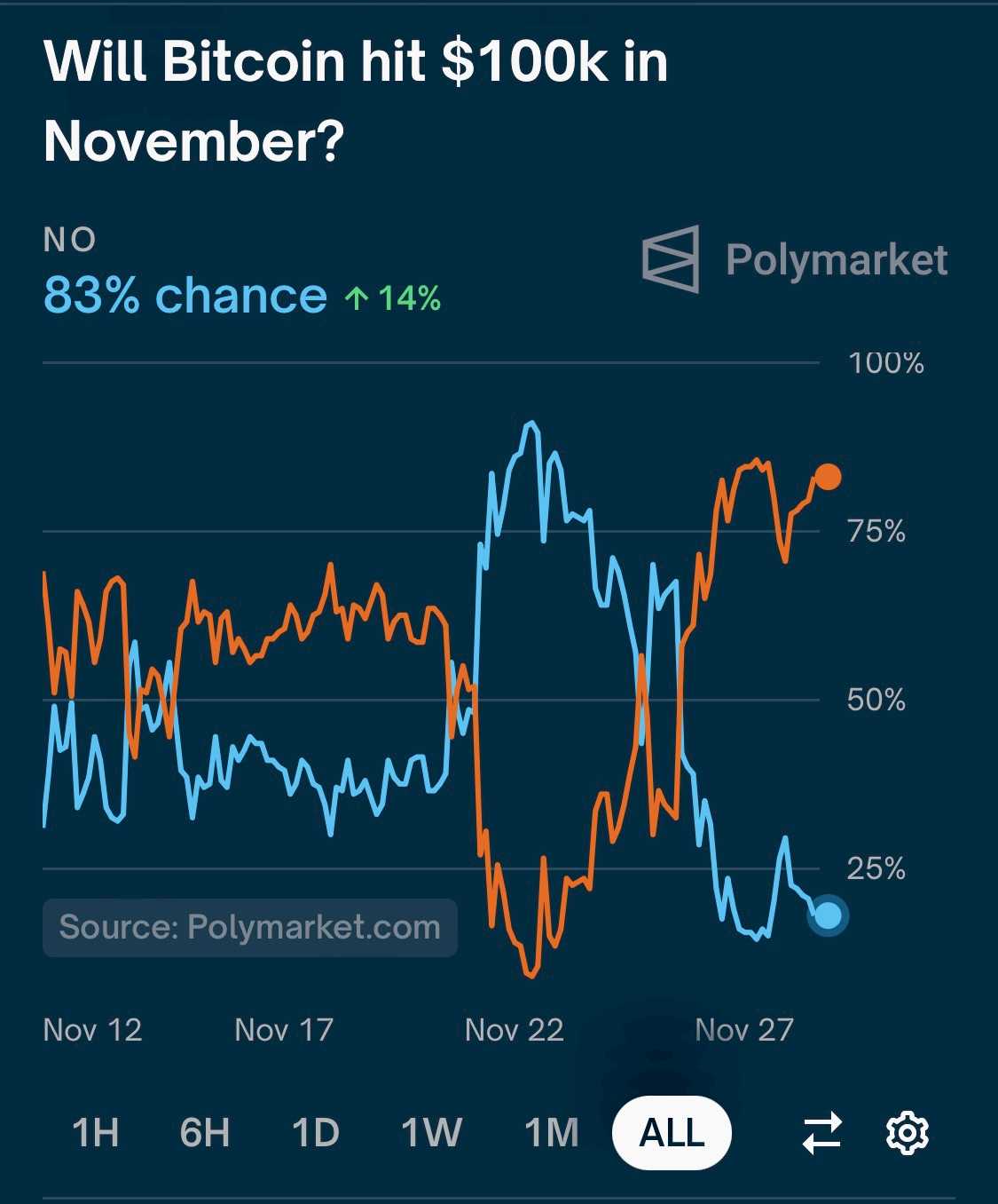 The chances of a $100,000 Bitcoin price in the polymarket for November are estimated by the following percentage ratio, what do you think?